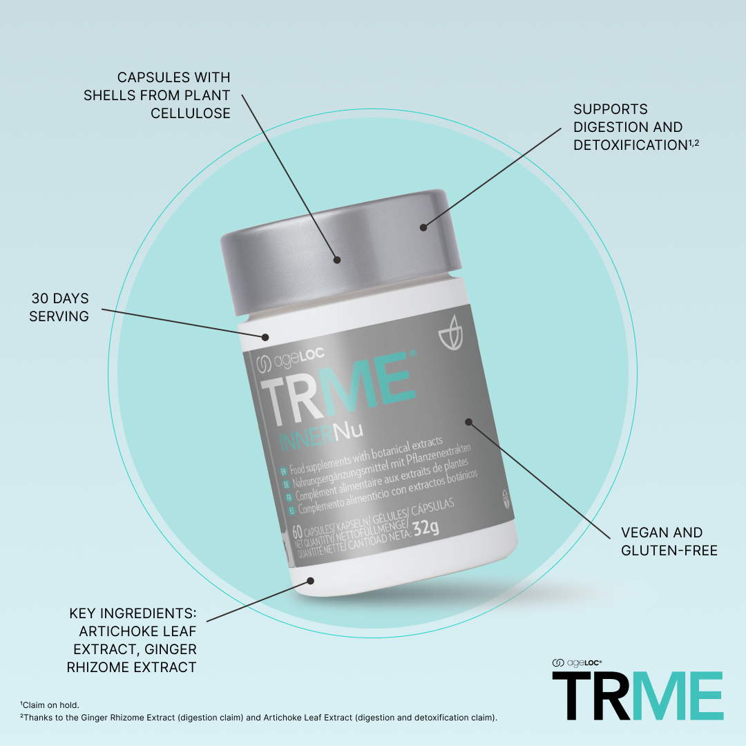 El bienestar intestinal puede contribuir a su sensación general de bienestar. TRME InnerNu ha sido diseñado para actuar como apoyo a su digestión gracias al extracto de rizoma de jengibre y al extracto de hoja de alcachofa, este último ingrediente que además ayuda a su cuerpo a desintoxicarse.