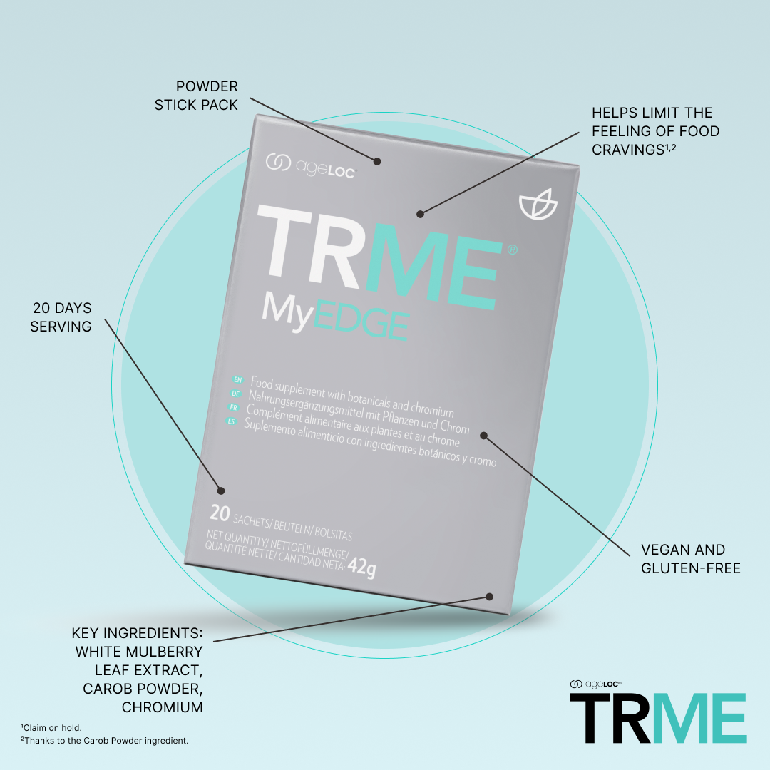 ¿Sabías que las ganas de comer pueden deberse a muchas razones? A veces es simplemente porque tienes hambre, otras veces picas para sentirte mejor, y a veces simplemente por costumbre o aburrimiento, ¡lo cual está perfectamente bien! Pero si quieres controlar tus antojos, TRME MyEdge puede ayudarte. Contiene Algarroba en Polvo que te ayudará a limitar la sensación de hambre o la ansiedad por la comida,* sin importar cuáles sean tus motivaciones.