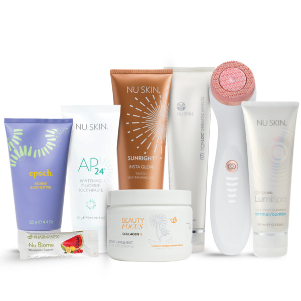 This set contains: LumiSpa, Collagen, Baobab Body Butter, Sunright Self Tan lotion, Ap24, Dermatic Effects and Nu Biome taster. Exclusively available in the US.