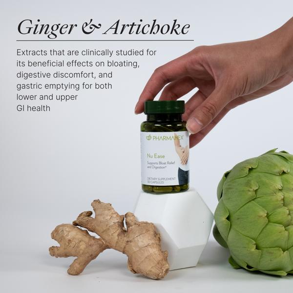 A standardized combination of artichoke leaf and ginger root extracts that is clinically studied for its beneficial effects on bloating, digestive discomfort, and gastric emptying for both lower and upper GI health.
